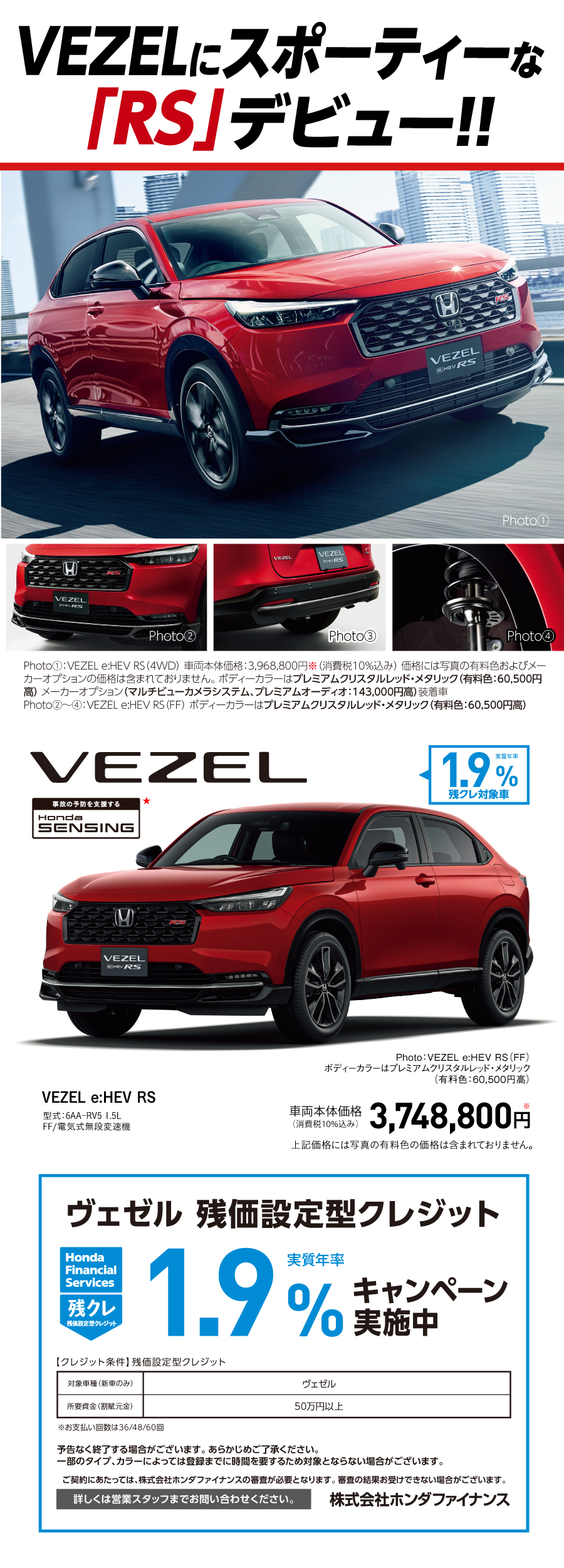 街中でも、郊外でも、自分らしく走れるスポーティーSUV。新型「VEZEL e:HEV RS」をぜひ店頭でご体感ください。今なら残価設定型クレジット金利1.9%(実質年率)でお買い得にご購入いただけます。低金利だからこそ、月々の負担を抑えながらワンランク上の走りを楽しめるチャンスです。